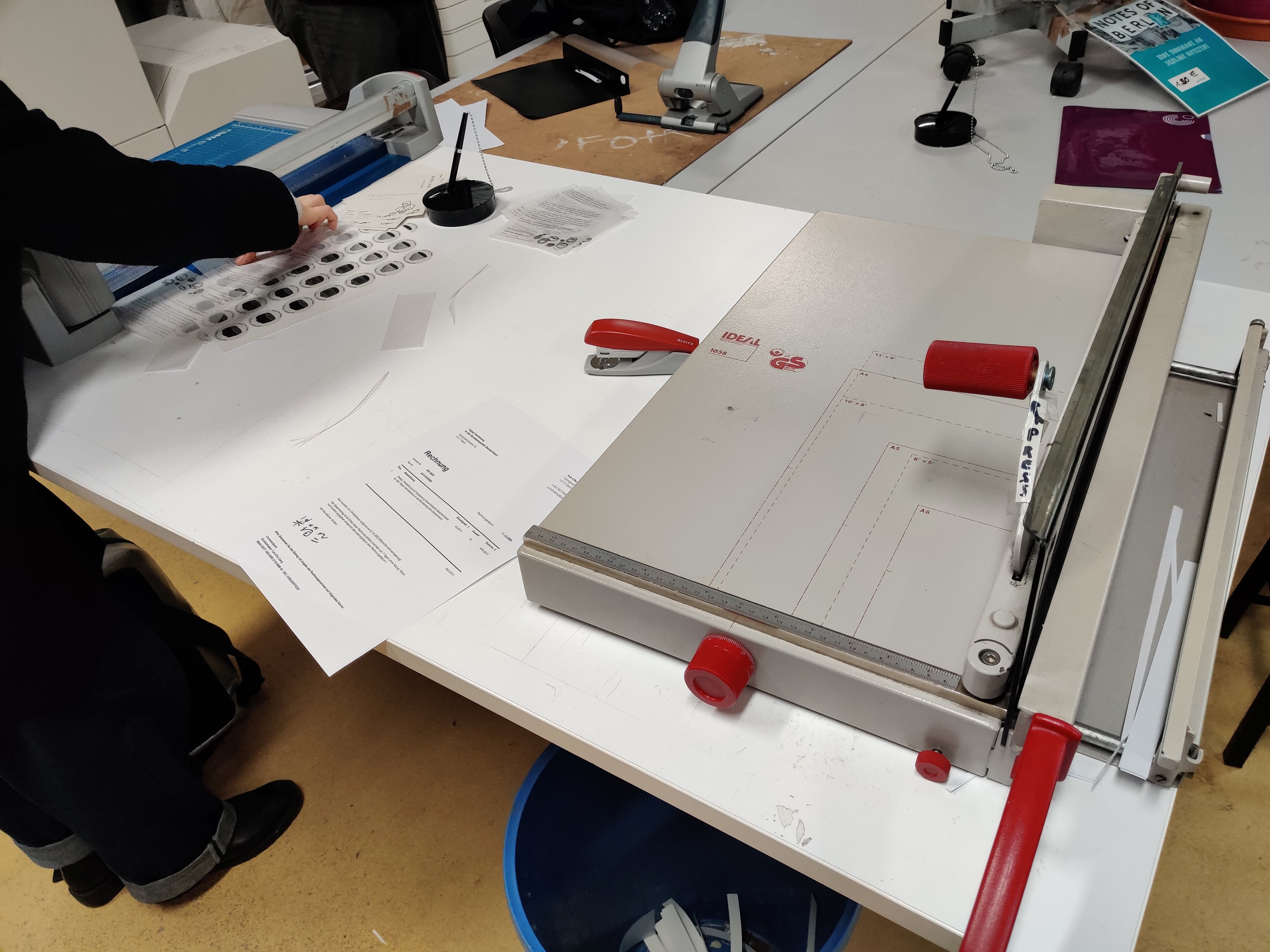 Sobald Sie mit dem Drucken fertig sind, können Sie die Guillotinen und Hefter auf dem Tisch vor der Kasse verwenden.