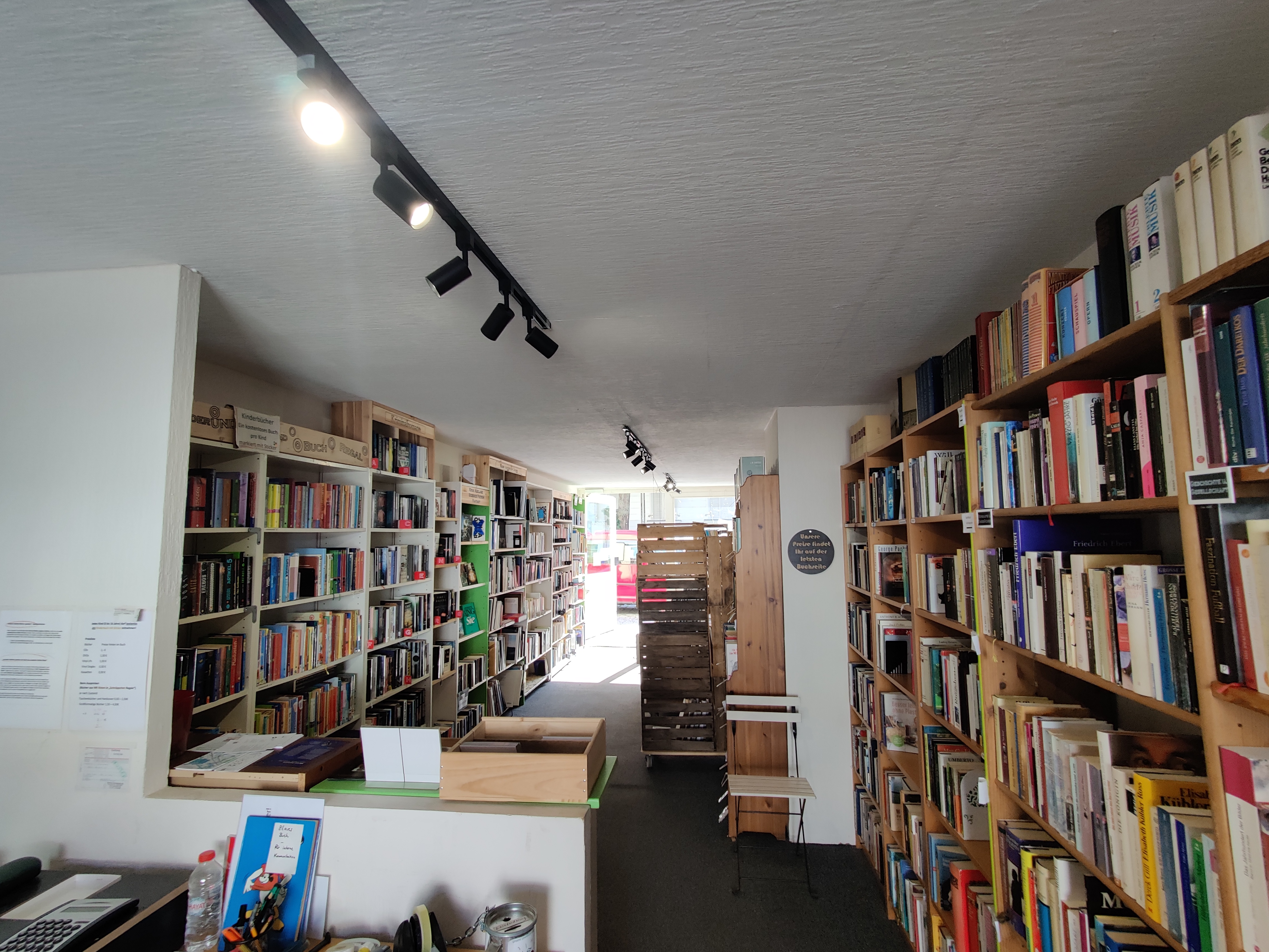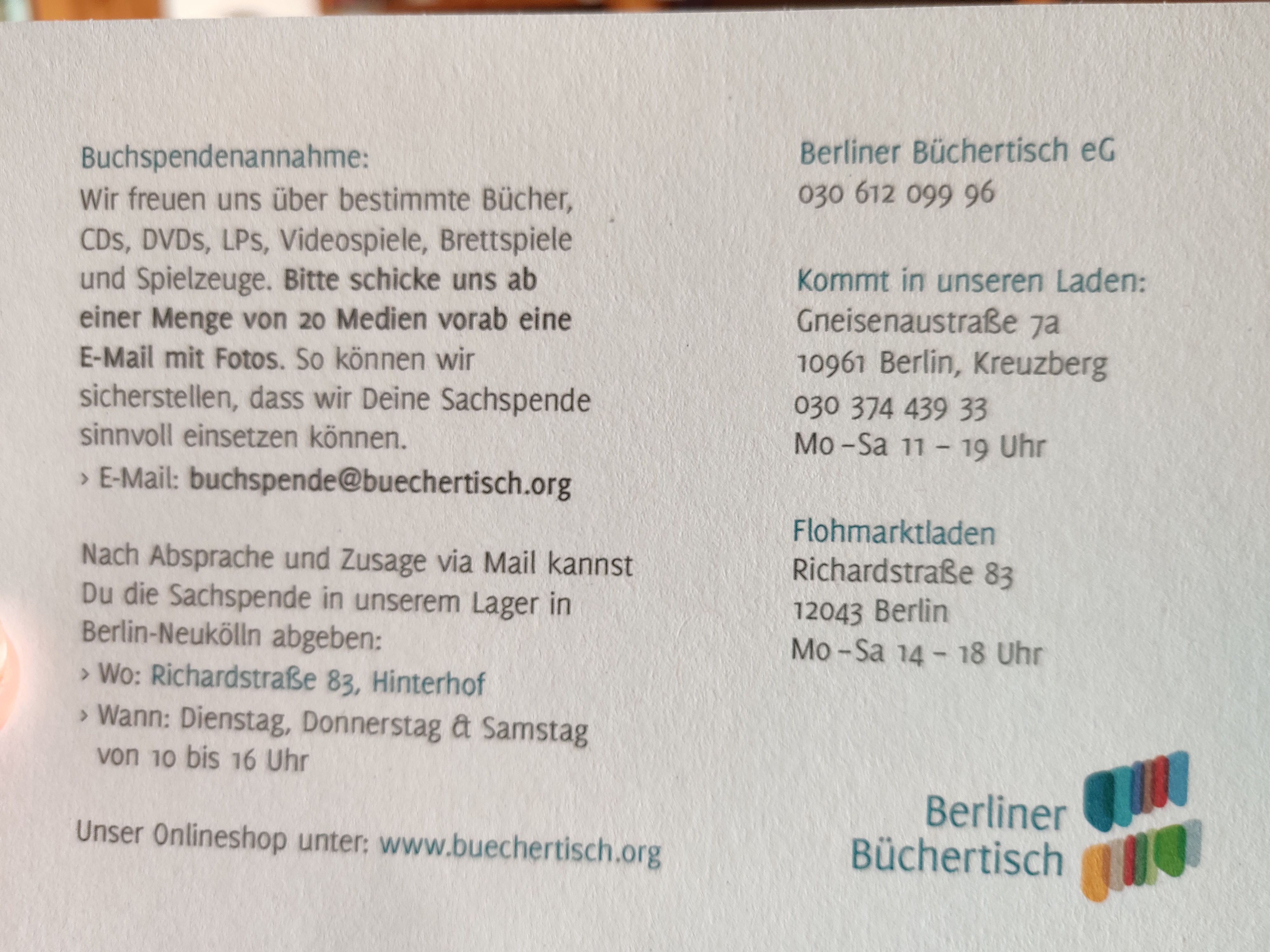 To donate, you can bring up to 20 items to the shop or set an appointment for bringing more than 20 books by calling 030-61209996.