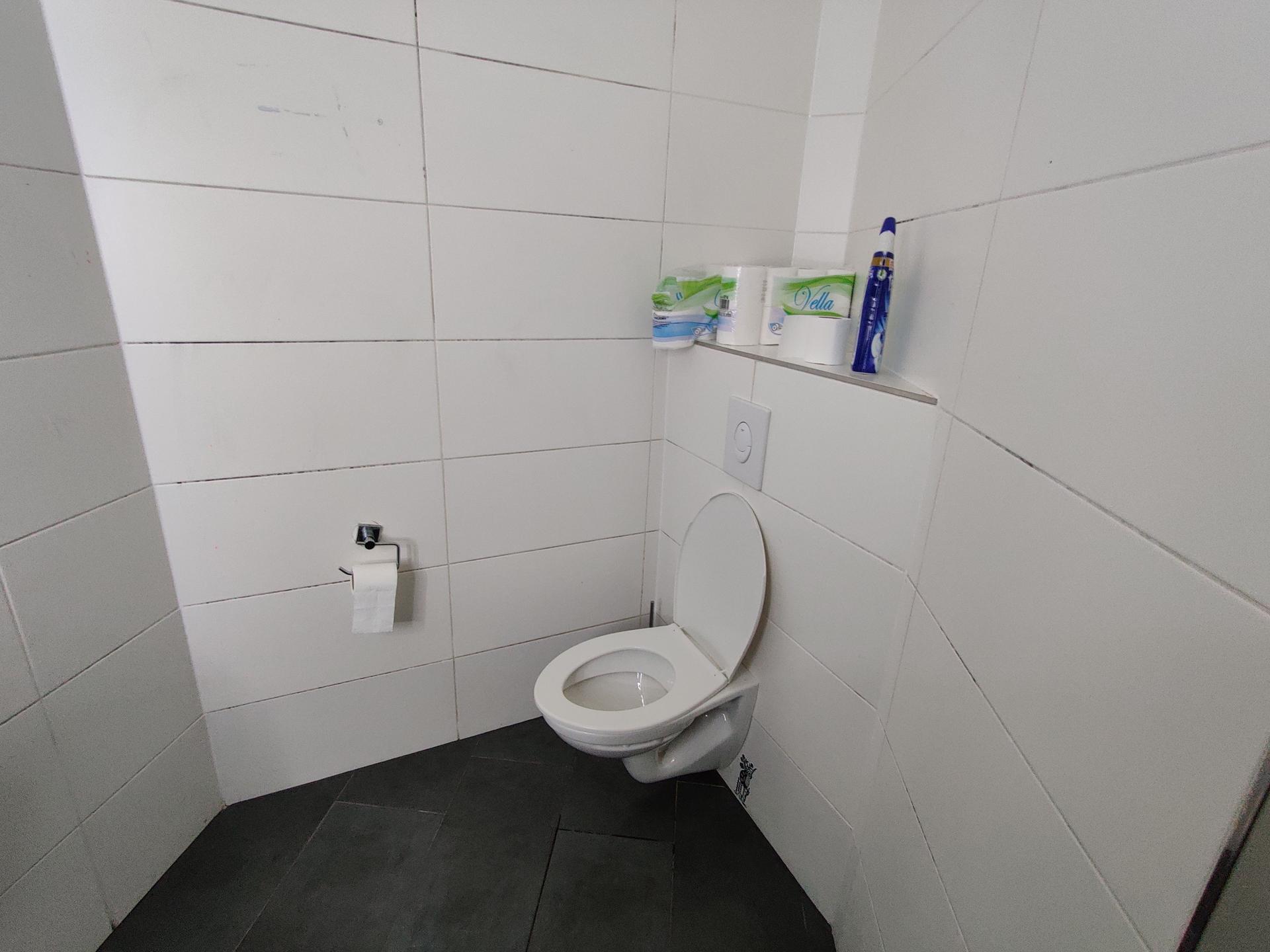 A rather spacious one-cell gender-neutral toilet, but with a narrow door and no support fixtures.
