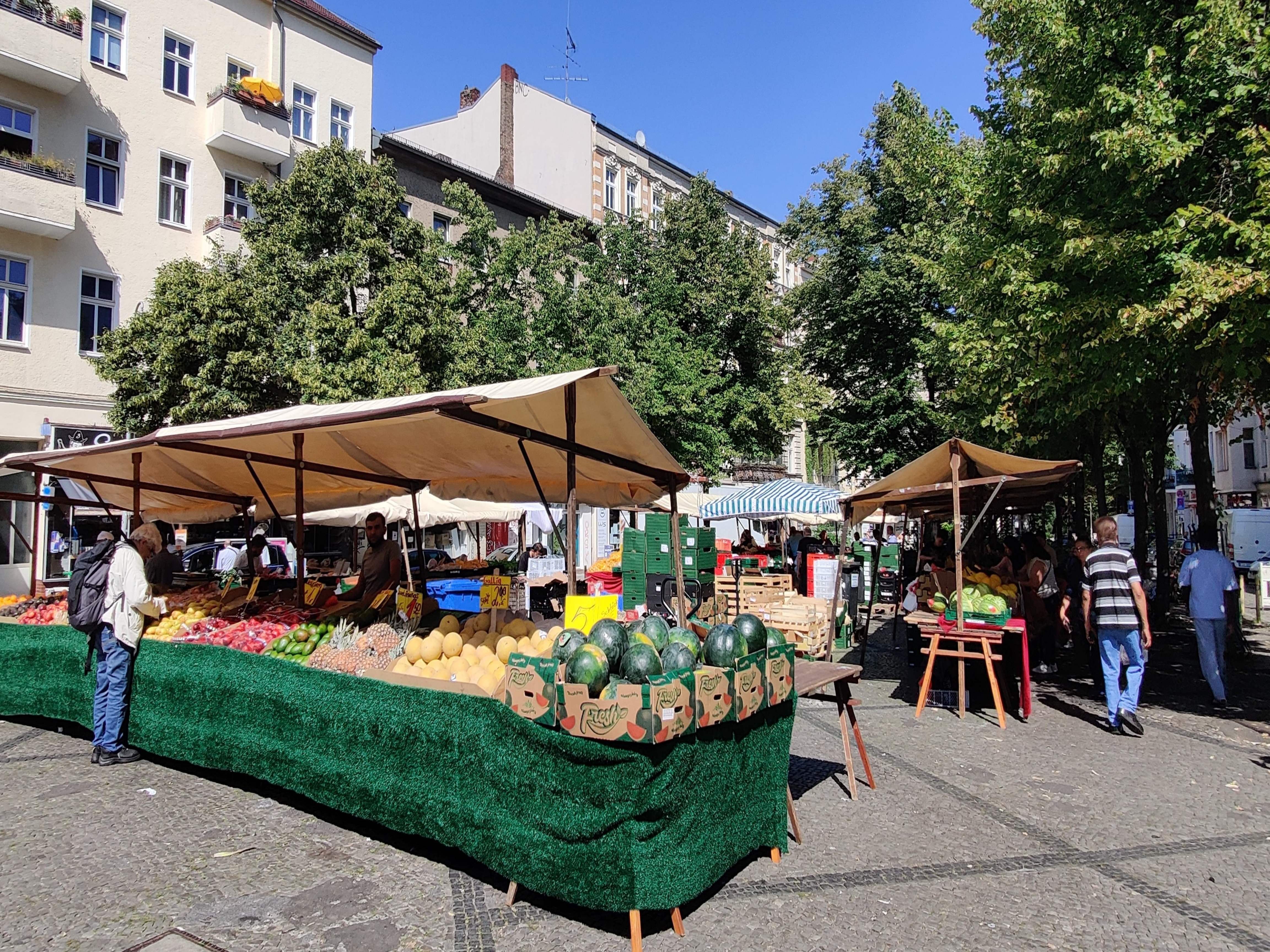 A small produce market open on Wednesdays and Saturdays, where you can get produce at low prices as well as Middle Eastern bread, Polish produce and drink coffee.